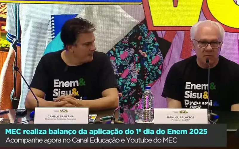 Ministro da Educação, Camilo Santana, e presidente do Inep, Maunel Palácios, fazem balanço do primeiro dia do Enem 2025. Foto: Print/Youtube do MEC.
