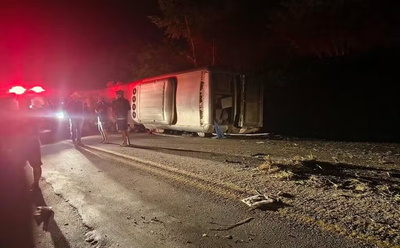 O ônibus tombou por volta das 19h40 de sexta (17) e o acidente deixou a pista interditada até as 4h do sábado (18). Segundo a PRF, o trecho é sinuoso e tem pouca iluminação.