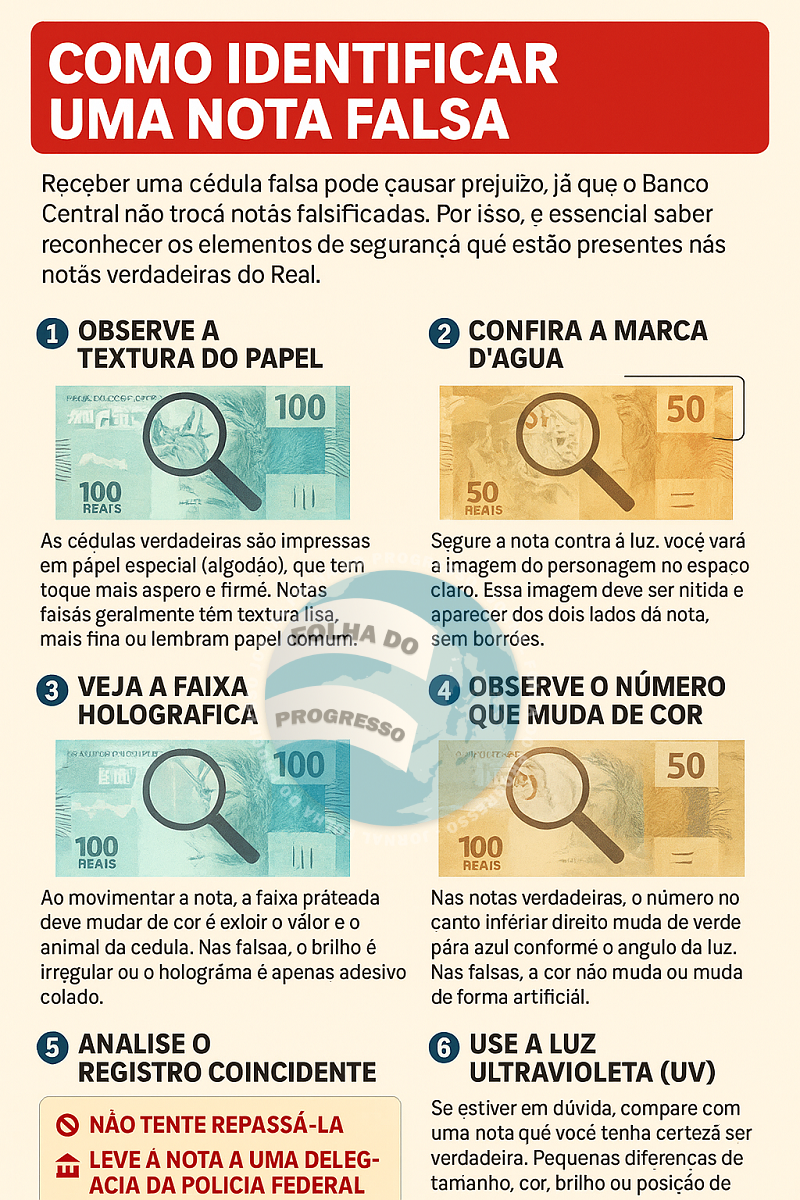 💡 Dica: compare com uma nota verdadeira e, em caso de dúvida, não repasse — entregue à polícia ou a um banco.