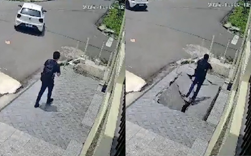 No vídeo, é possível ver o pedestre caminhando normalmente pela calçada quando o solo cede de forma repentina, fazendo com que ele desapareça no buraco. Em seguida, dois motociclistas que passavam pelo local param para prestar socorro à vítima.
