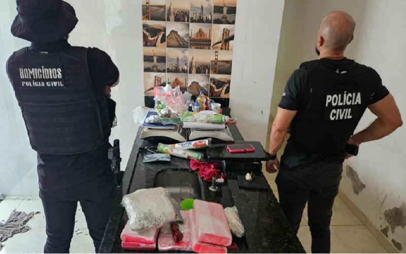 Após monitoramento, os agentes confirmaram as informações e realizaram a abordagem. Durante a revista na casa, foram apreendidas substâncias semelhantes à cocaína, maconha e crack. Também foram encontrados materiais usados para embalar drogas, como rolos de papel filme e pinos plásticos, além de balanças de precisão, celulares, equipamentos eletrônicos e um notebook.