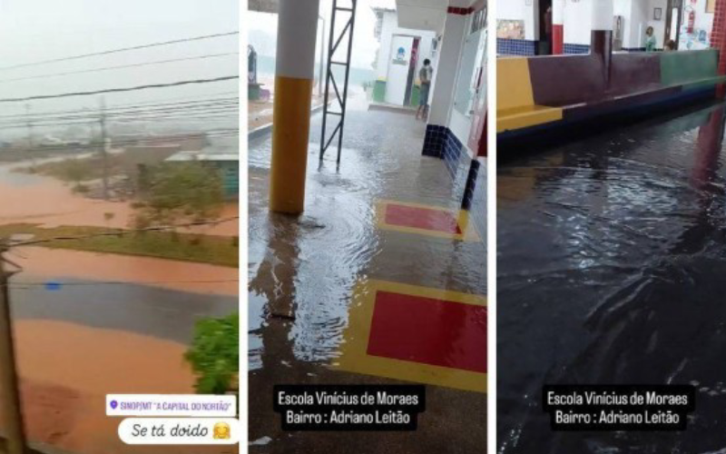 Uma forte chuva foi registrada na cidade de Sinop (478 km de Cuiabá) na tarde desta terça-feira (23). Por conta do temporal, ruas ficaram alagadas e até uma escola ficou inundada.