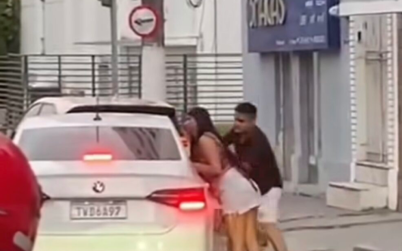 Foto: Reprodução | No vídeo é possível ver a mulher próximo da janela de um carro, enquanto o suposto marido a espera em outro, parado logo na frente.