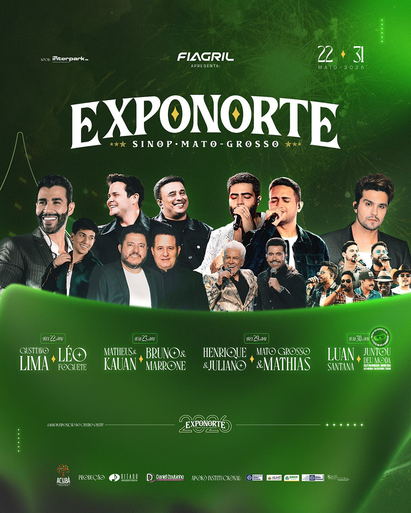 Foto: Reprodução |Reconhecida como uma das feiras agropecuárias mais tradicionais e influentes do agronegócio mato-grossense, a Exponorte de Sinop prepara uma edição histórica para 2026. A organização do evento divulgou na noite desta segunda-feira (17) as atrações musicais que prometem transformar a feira em um dos maiores espetáculos culturais já realizados na região norte de Mato Grosso. Entre os destaques estão alguns dos principais nomes do sertanejo nacional: Gusttavo Lima • Léo Foguete • Matheus & Kauan • Bruno & Marrone • Henrique & Juliano • Mato Grosso & Mathias • Luan Santana.