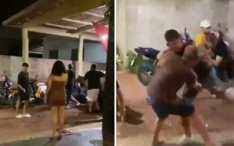 Foto: Reprodução | Um vídeo que circula nas redes sociais mostra uma briga em frente a uma tabacaria de Itaúba (a 580 km de Cuiabá), envolvendo os dois filhos do prefeito Antônio Ferreira de Oliveira Neto, conhecido como Toninho Tijolinho (PSB). A confusão aconteceu na madrugada de domingo (2), após o encerramento de uma festa à fantasia.