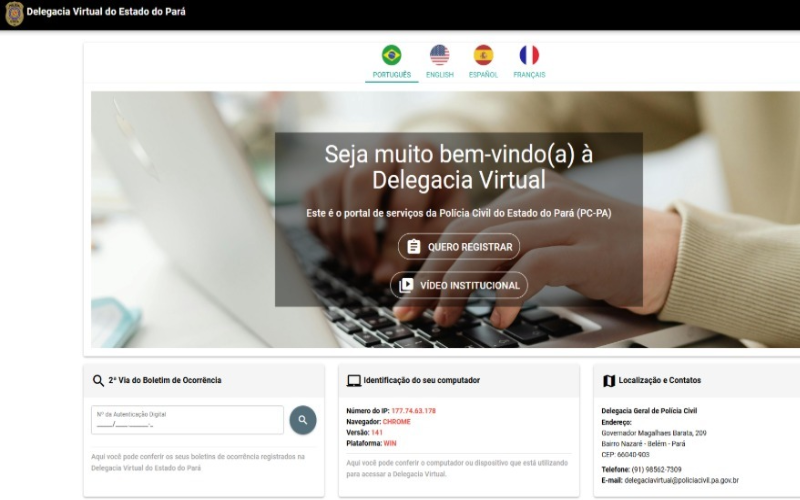 Histórico – A Delegacia Virtual da Polícia Civil do Pará, gerenciada pela Diretoria de Informática, Manutenção e Estatística (Dime) da PCPA, foi criada em 2004 como uma ferramenta para o registro de perda ou extravio de documentos e ocorrências de menor gravidade. “Em 2020, durante a pandemia, o sistema foi expandido para incluir crimes como furto, roubo, incêndio, estelionato, ameaça, crimes de ódio, de perseguição, contra animais, entre outros. Com a realização da COP30 em Belém, nós aprimoramos ainda mais o serviço para garantir que cidadãos estrangeiros também possam registrar ocorrências de forma simples e acessível”, finalizou o gestor da PCPA.