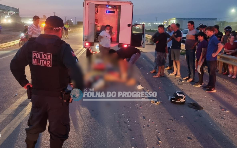 Ao chegar ao ponto informado, os policiais encontraram uma motocicleta de placa KAP-8294 em chamas e uma vítima caída ao solo, apresentando múltiplas fraturas expostas.