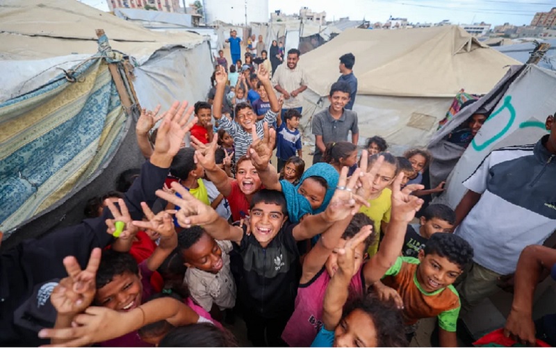 Crianças palestinas celebram novo acordo de cessar-fogo entre Israel e Hamas em um campo para deslocados em Nuseirat, no centro da Faixa de Gaza. 09/10/2025 – (Foto:Eyad Baba/AFP)