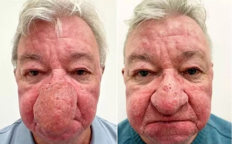 Um escocês de 68 anos que ficou impossibilitado de beijar a própria esposa devido ao crescimento anormal do nariz passou por uma cirurgia reconstrutiva que transformou sua vida. Gerard McAliece, morador de Kilmalcolm, na Escócia, enfrentava um dos casos mais graves de rinofima já vistos por médicos no Reino Unido. A condição é desencadeada pela multiplicação das glândulas sebáceas no nariz e no tecido conjuntivo, causando inchaço, vermelhidão e deformação.