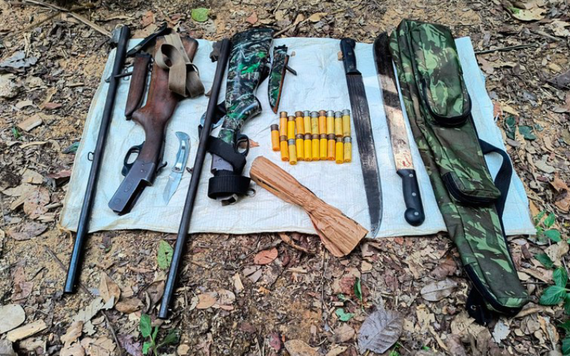 Os indivíduos portavam espingardas calibre .20, munições e armas brancas, além de estarem com um veado-mateiro fêmea abatido e mutilado, espécie nativa da fauna brasileira.