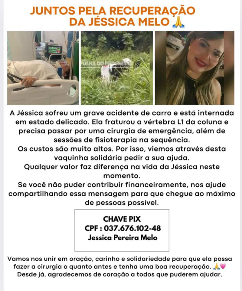 Jéssica foi levada inicialmente ao Hospital Municipal de Novo Progresso e, posteriormente, transferida para Itaituba, onde aguarda vaga e equipe para a cirurgia. Após o procedimento, ela ainda precisará passar por várias sessões de fisioterapia, o que aumenta os custos do tratamento.