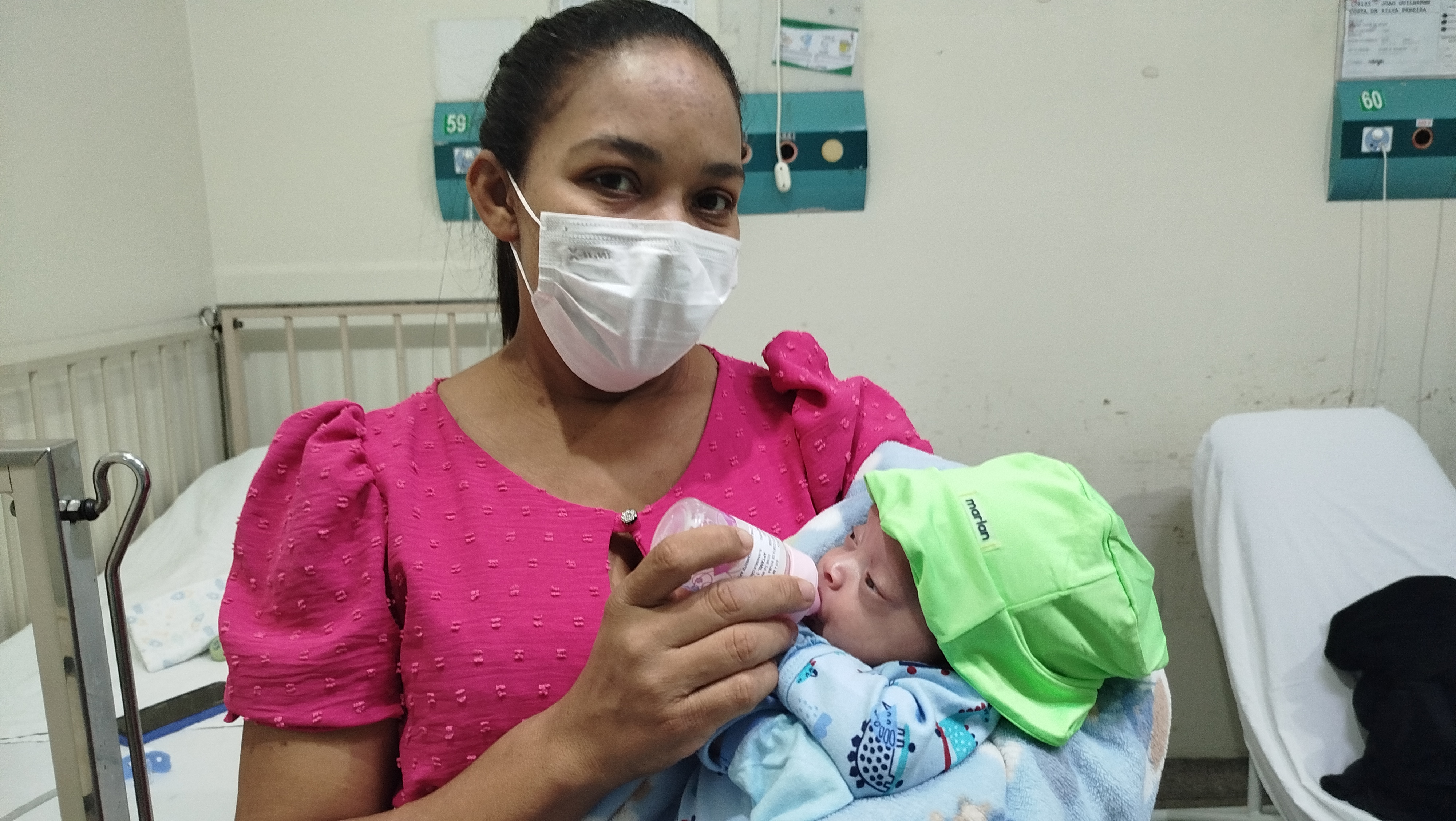 Fernanda Nayara, mãe de Augusto dando mamadeira para o filho no HRSP. Fotografia Ascom