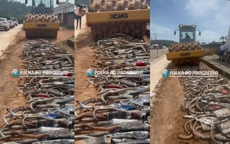 A destruição dos escapamentos foi realizada com o uso de um rolo compressor, simbolizando o compromisso das autoridades com a ordem, a segurança e o sossego público.