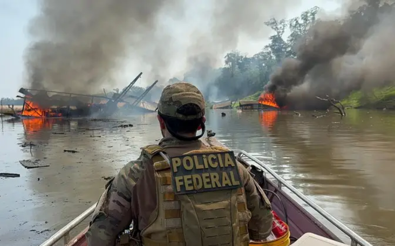 Agentes da Polícia Federal destroem balsas utilizadas para garimpo ilegal durante operação no Rio Madeira, no Amazonas (Divulgação/Polícia Federal)