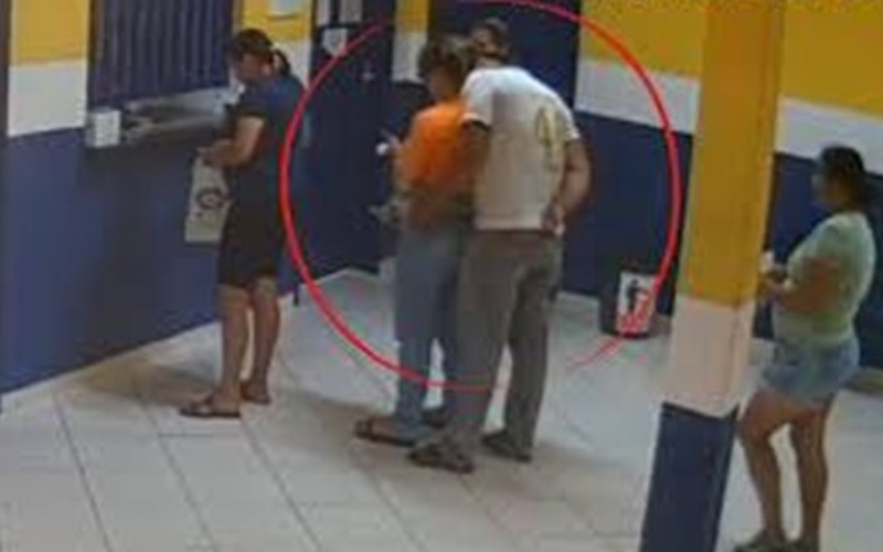 Nas imagens, um homem aparece entrando na fila de atendimento e se posiciona logo atrás de uma mulher de maneira suspeita. A vítima percebe a movimentação, olha para trás e tenta se