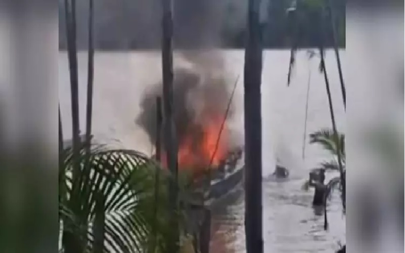 Foto: Reprodução | Uma lancha de pequeno porte de propriedade particular pegou fogo na manhã de terça-feira (30), no rio Arrozal, em Barcarena. Nas imagens, pessoas jogam a própria água do rio para conter as chamas.