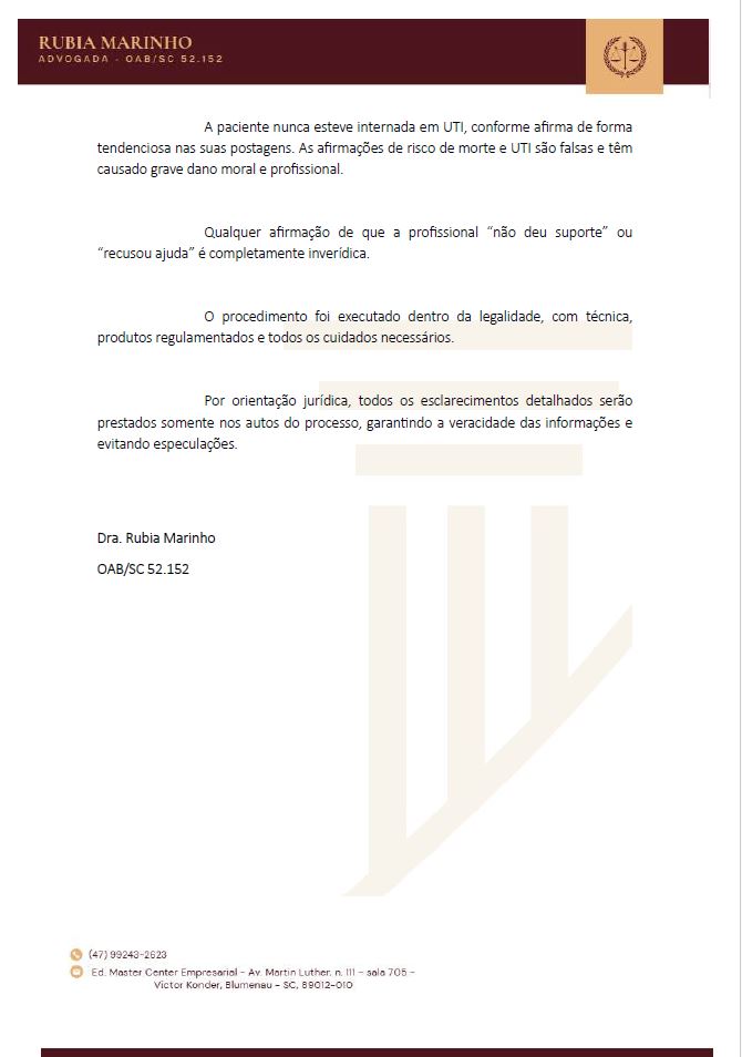 Ainda, a influencer afirmou nas redes sociais que esteve em risco de vida, ficou internada em UTI e que seu quadro seria consequência direta do procedimento estético. Essas informações não encontram respaldo no laudo médico apresentado pela própria paciente. A paciente nunca esteve internada em UTI, conforme afirma de forma tendenciosa nas suas postagens. As afirmações de risco de morte e UTI são falsas e têm causado grave dano moral e profissional.