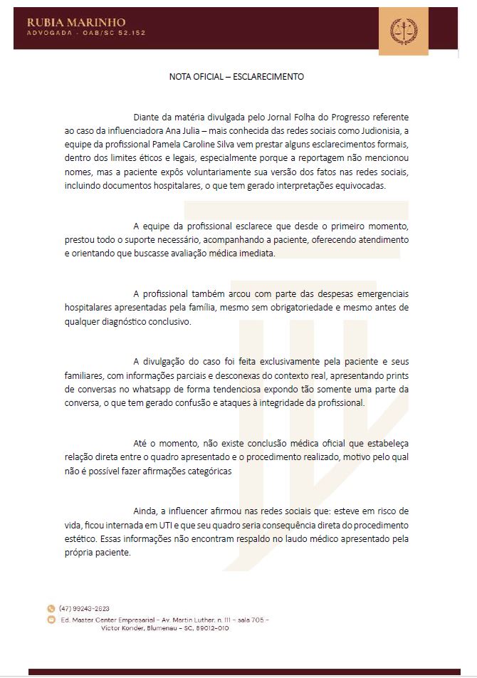 Diante da matéria divulgada pelo Jornal Folha do Progresso referente ao caso da influenciadora Ana Julia – mais conhecida das redes sociais como Judionisia, a equipe da profissional Pamela Caroline Silva vem prestar alguns esclarecimentos formais, dentro dos limites éticos e legais, especialmente porque a reportagem não mencionou nomes, mas a paciente expôs voluntariamente sua versão dos fatos nas redes sociais, incluindo documentos hospitalares, o que tem gerado interpretações equivocadas.