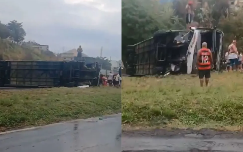 Em imagens divulgadas na internet é possível ver o ônibus tombado na rodovia e torcedores andando no meio da rua, além de um homem caído no meio da estrada.