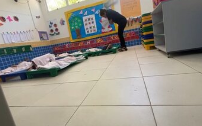 Foto: Reprodução | Vídeos feitos por funcionárias mostram gritos, puxões de cabelo e agressões durante descanso na sala de aula; mães relatam que filhos apresentavam medo de ir para a escola