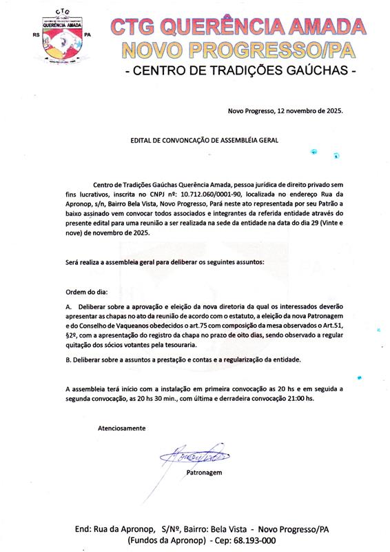 Centro de Tradições Gaúchas: Querência Amada, pessoa jurídica de direito privado sem fins lucrativos, inscrita no CNPJ nº: 10.712.060/0001-90, localizada no endereço Rua da Apronop, s/n, Bairro Bela Vista, Novo Progresso, Pará neste ato representada por seu Patrão a baixo assinado vem convocar todos associados e integrantes da referida entidade através do presente edital para uma reunião a ser realizada na sede da entidade na data do dia 29 (Vinte e nove) de novembro de 2025.
