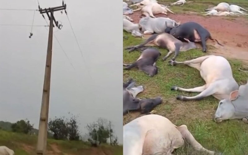 Metade de um rebanho de gado morreu após uma descarga elétrica atingir uma propriedade rural no distrito de Caracol, em Trairão, na madrugada da última quinta-feira (20). Segundo informações preliminares, um raio teria atingido um poste de energia próximo à fazenda, provocando uma sequência de descargas que alcançou os animais.