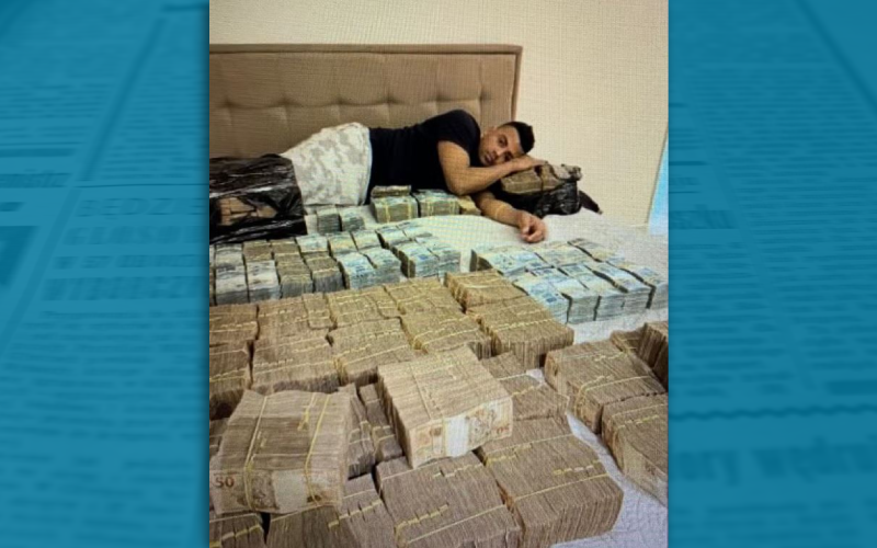 TH Joias deitado numa cama com maços de reais; PF suspeita que seja R$ 5 milhões — Foto: Reprodução