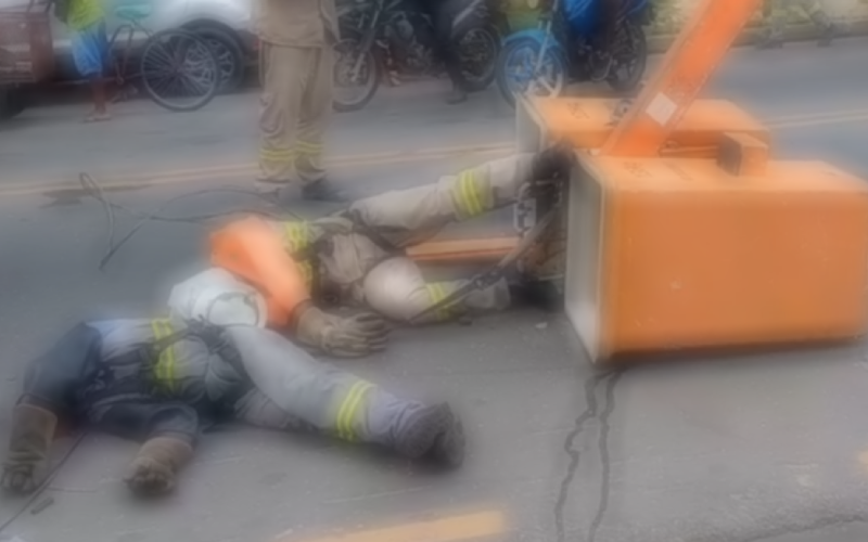 Nos vídeos é possível ver dois homens sem movimento caídos no chão. Eles estavam trabalhando no momento do acidente.