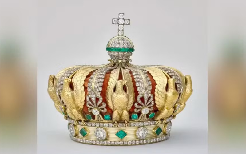- Uma coroa com safiras e quase 2.000 diamantes;