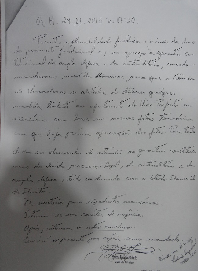 Em consonância dom o regimento interno da casa e a legislação vigente, na sessão poderia ter deliberado sobre o afastamento ou não do alcaide, ato normal onde o investigado pode ser afastado para não atrapalhar as investigações. O meritíssimo juiz de direito (substituto) Roberto Rodrigues Brito Jr de última hora acatou um pedido da assessora jurídica do prefeito e decidiu pedido de liminar em favor do Prefeito Joviano de Almeida, para que a Câmara não o afastasse do cargo até julgar o mérito da denuncia. A decisão foi a próprio punho, manuscrito em papel de oficio as 17:20 horas.