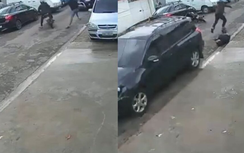 Foto: Reprodução | Câmeras de segurança registraram o momento em que dois homens em uma motocicleta se aproximam do carro e um deles aponta uma arma para a vítima, que vinha no sentido contrário.