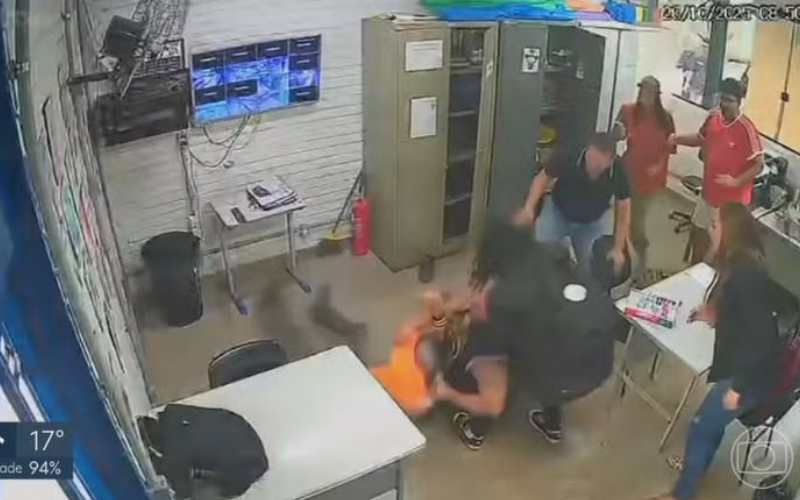 As imagens mostram o momento em que o homem entra na sala de coordenação e dá uma sequência de socos na cabeça do educador, que tenta se proteger antes de o agressor ser contido por outros funcionários.