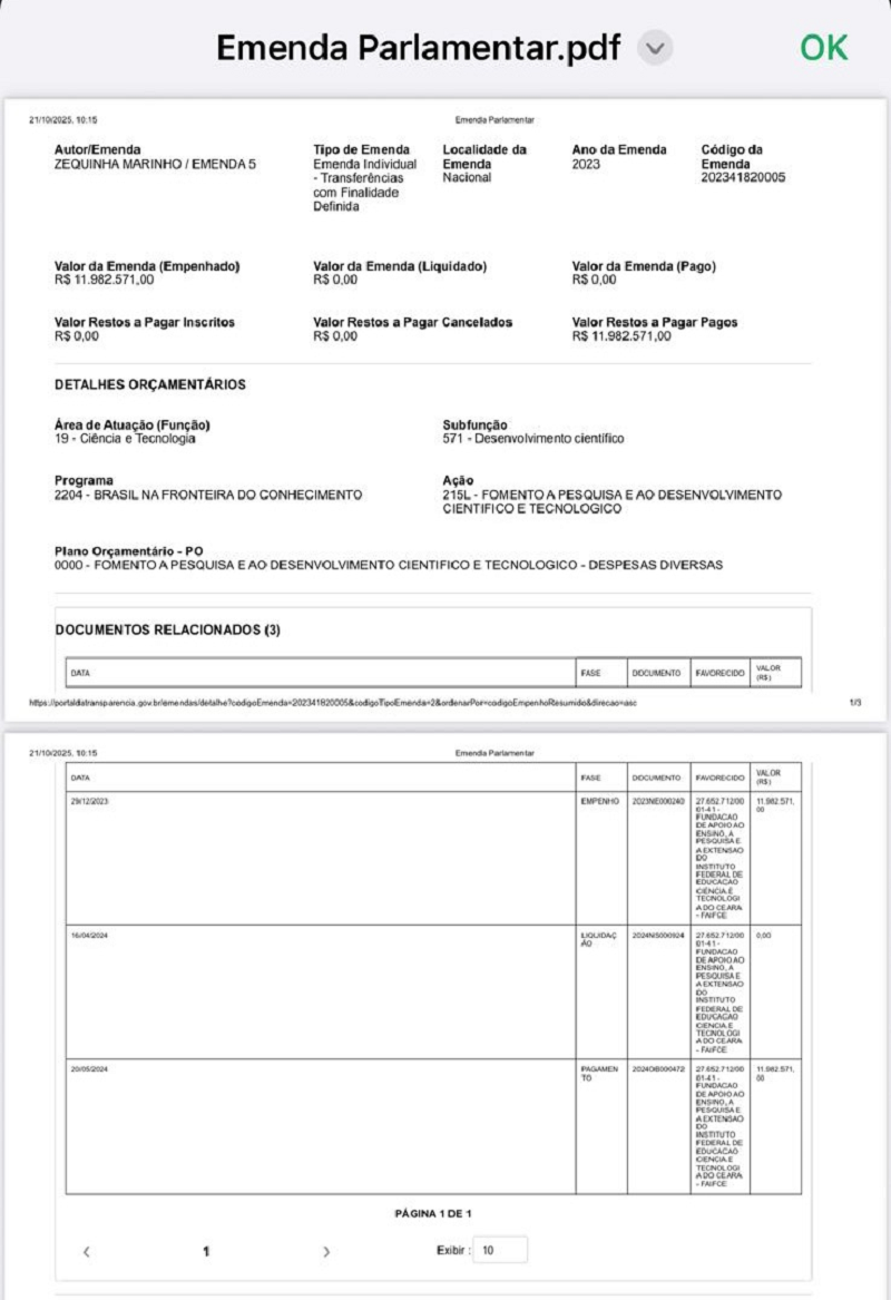 Anunciada em maio de 2024, a emenda de quase R$12 milhões foi inteiramente destinada ao Instituto Federal do Ceará (IFCE), enquanto nenhum instituto ou universidade do Pará recebeu recursos semelhantes. Nem a Universidade Federal do Pará (UFPA), a Universidade do Estado do Pará (UEPA), o Instituto Federal do Pará (IFPA) ou outras fundações de pesquisa no estado foram contempladas.
